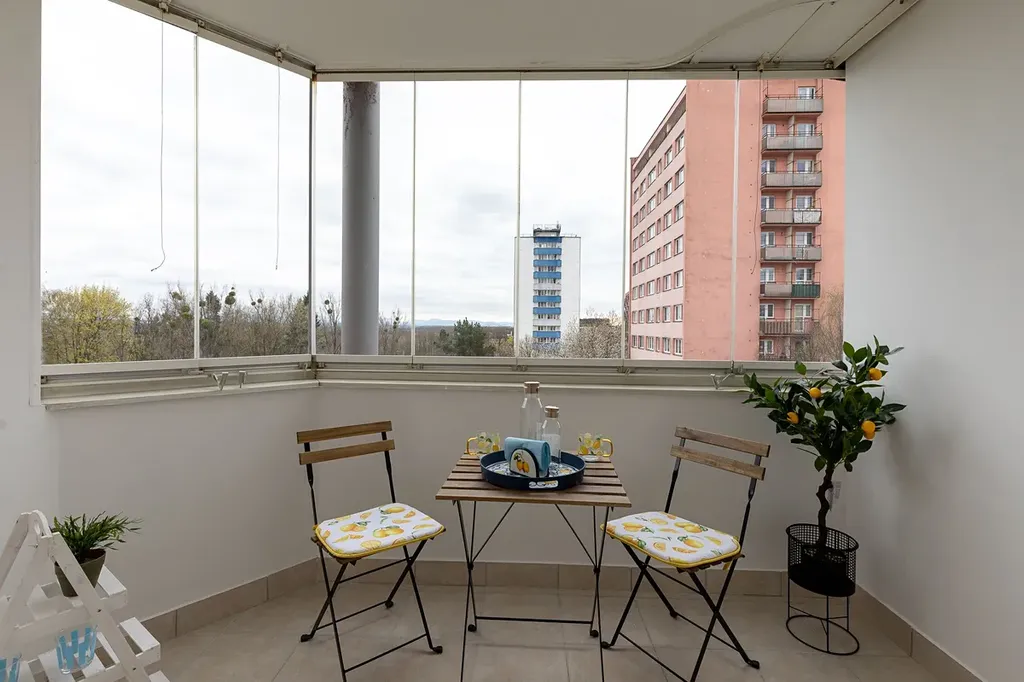 Z kuchyně je praktický vstup na prostornou zasklenou lodžii o ploše 6m2, kde můžete posnídat při východu slunce či si dát drink nebo pěstovat kytičky.