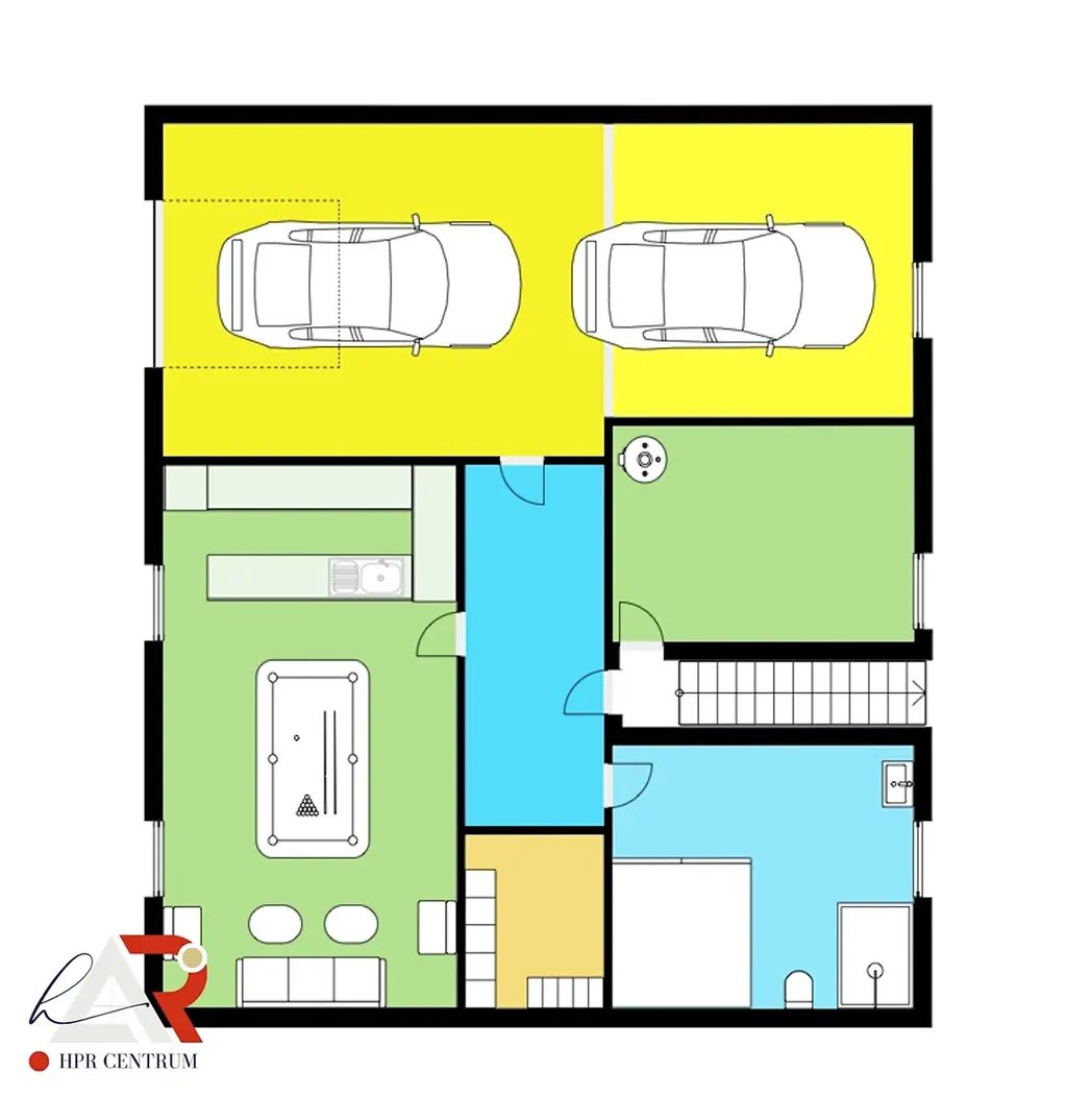 • Suterén: garáž pro 2 vozidla s dostatkem prostoru pro dílnu, společenská místnost s kulečníkem a barem, sauna se sprchou a WC