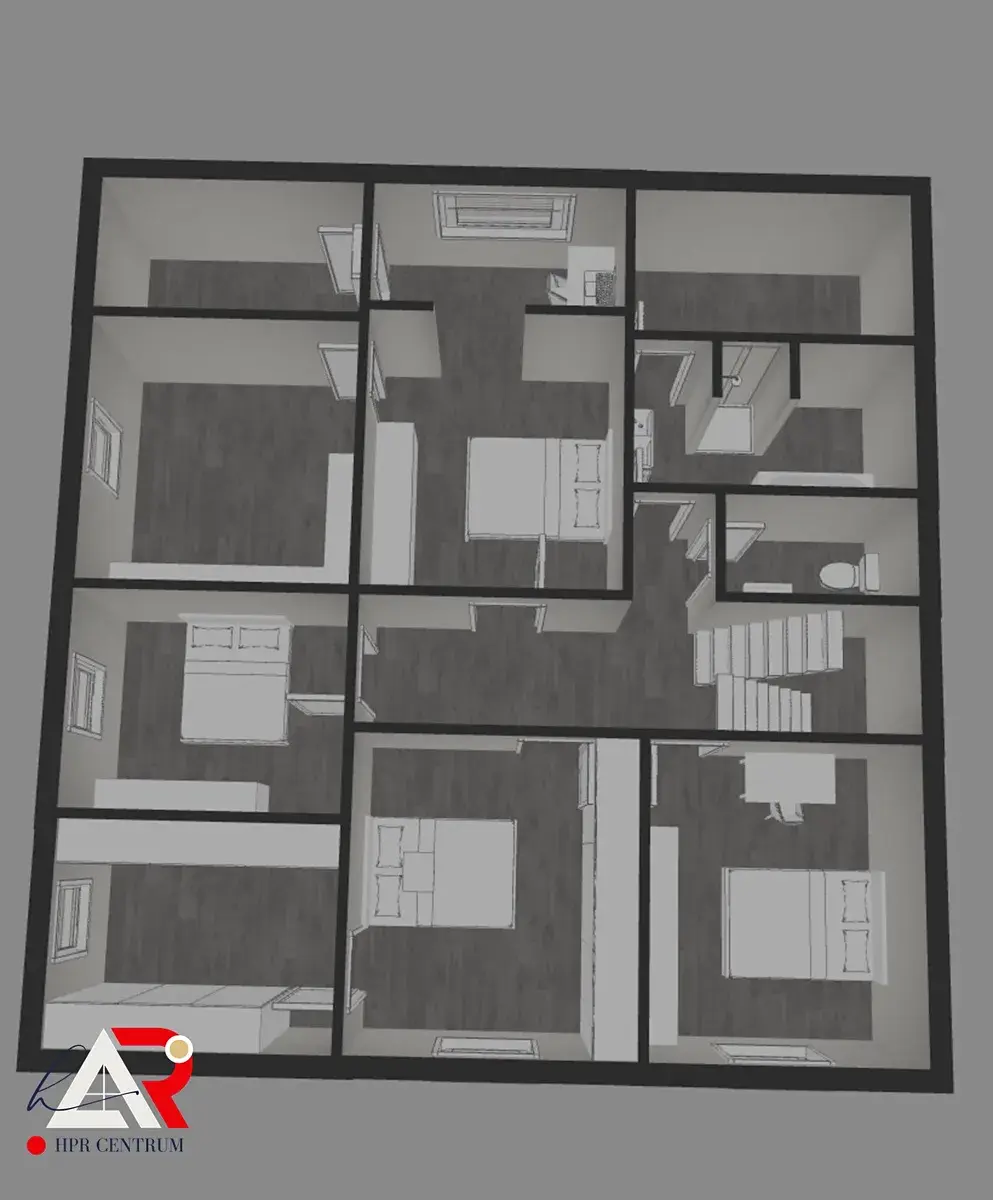 • Podkroví: 6 obytných místností, prostorná koupelna s vanou i sprchou, samostatné WC, 2 komory