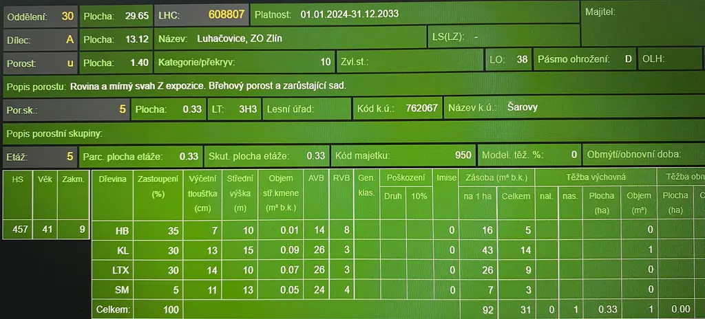 Prodej lesního pozemku v katastrálním území Šarovy, okr. Zlín. Jedná se o pozemek p.č. 778 o výměře 11.619 m². Pozemek se nachází na rovině až mírně svažitém terénu s přístupem po katastrované nezpevněné komunikaci ve vlastnictví státu a obce. Na ploše pozemku se nachází dle platných LHO v největší míře lesní porost habru, borovice, břízy, smrku, jasanu a ostatních listnatých tvrdých dřevin ve věku 22 let, dále pak lesní porost habru, borovice, smrku, javoru a ostatních tvrdých listnatých dřevin ve věku 42 let. Pozemek je vhodný pro stavbu účelového zařízení sloužící lesu a zvěři ( posed, krmelec, chatka atd. ). Informace na tel. nebo e-mailu.