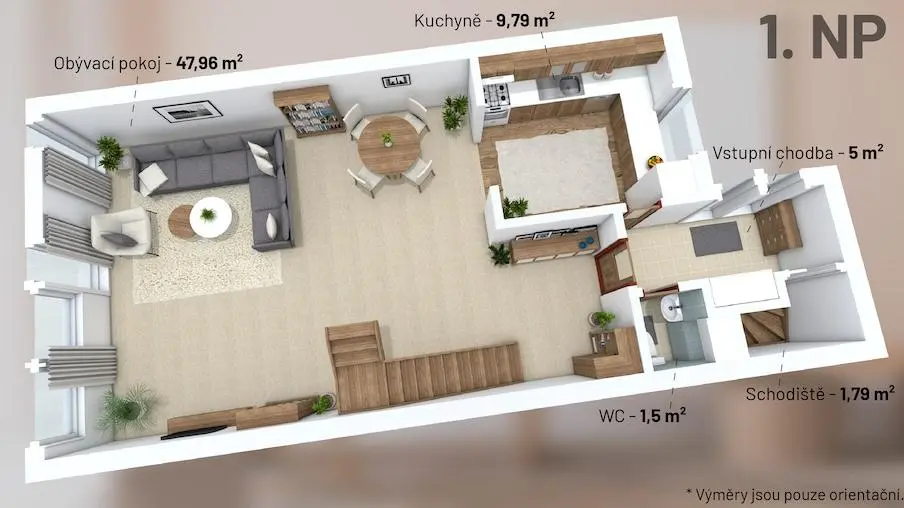 Dominantou domu je obývací pokoj s kuchyní a přímým vstupem na terasu a zahradu. Dispozice je navržená tak, aby fungovala v běžném životě a nabídla dostatek prostoru pro všechny členy domácnosti. Celková plocha domu i s garáží a sklepem je 183 m2. Z toho čistě obytná část má cca 125 m2.