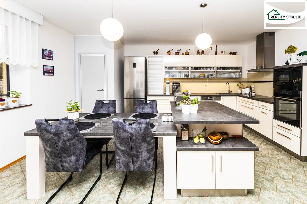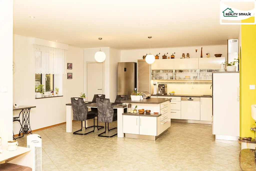 Dominantou je velkorysý obytný prostor s kuchyní propojenou s obývacím pokojem a přímým vstupem na zahradu. Tento prostor přirozeně spojuje interiér s exteriérem a vytváří ideální místo pro rodinný život i společenská setkání.