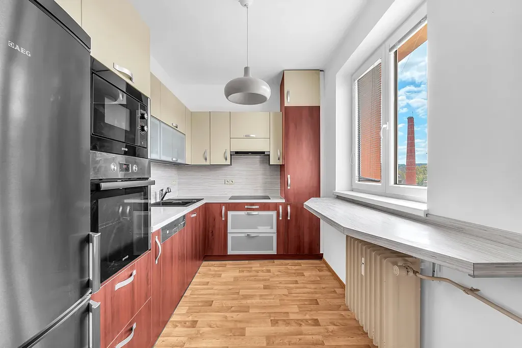 Zařízená kuchyňská linka (vysoká lednice AEG, vestavěná mikrovlnná trouba a elektrická trouba Gorenje, myčka nádobí, sklokeramická deska, digestoř)