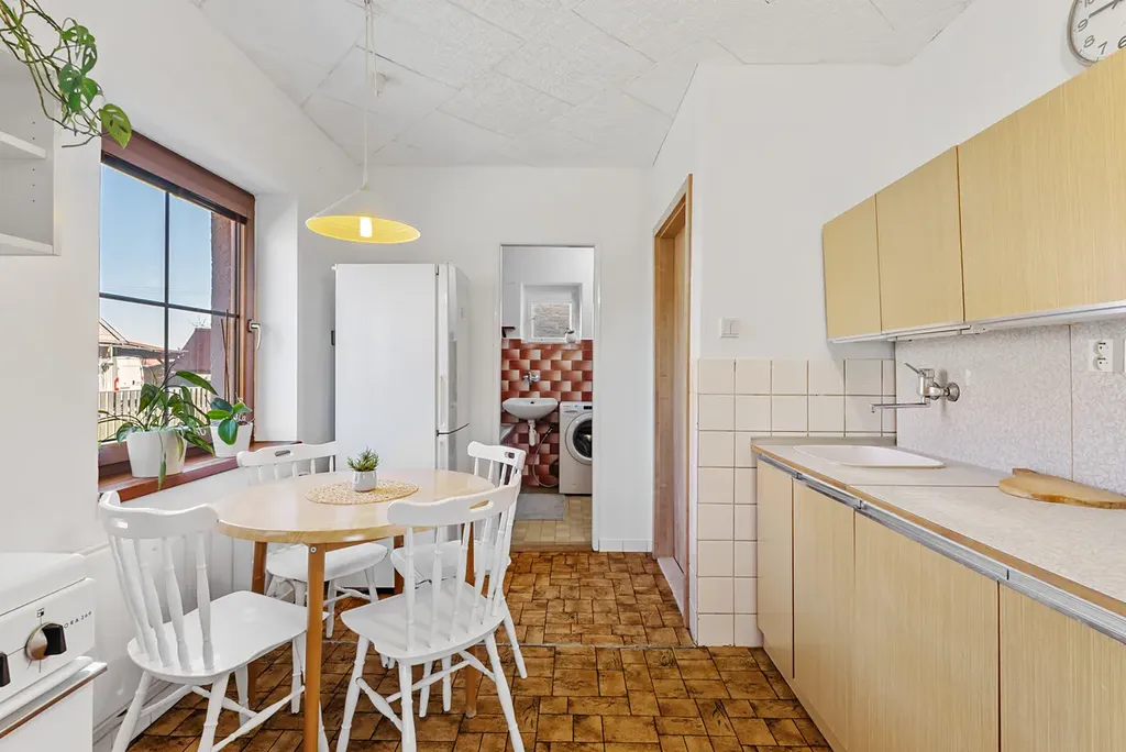 Dům je z větší části po rekonstrukci. V přízemí najdete kuchyň s obývacím prostorem, ložnici, šatnu , koupelnu s WC a vstupní chodbu z které se dostanete do další části domu, kde na vás čeká byt o velikosti 1+1 s koupelnou a WC. V patře se nachází 3 pokoje a vstup na rozlehlou balkonovou terasu. Dům je vytápěn tepelným čerpadlem, je částečně podsklepen.