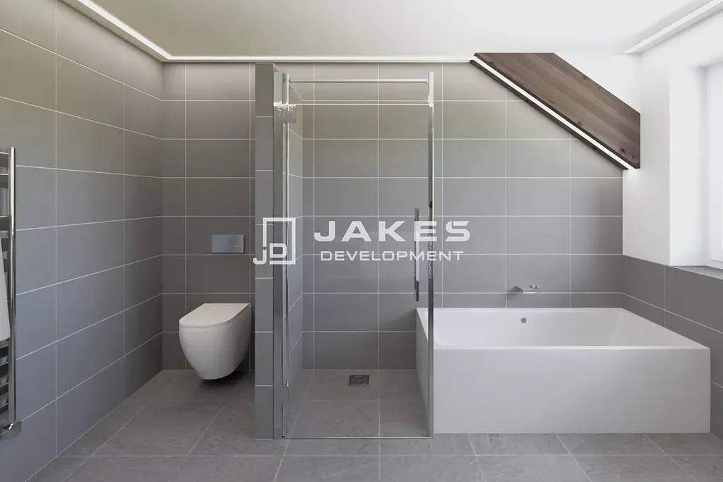 Dřevěné podlahy s podlahovým vytápěním – pro maximální komfort a příjemnou atmosféru domova. Koupelna s velkoformátovou dlažbou a moderními sprchovými podomítkovými bateriemi. Venkovní žaluzie – snadná regulace světla i soukromí. HS portál s trojsklem – zajišťuje špičkovou tepelnou izolaci a odhlučnění. Energetická náročnost budovy třídy B – nízké provozní náklady.