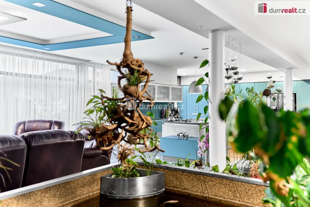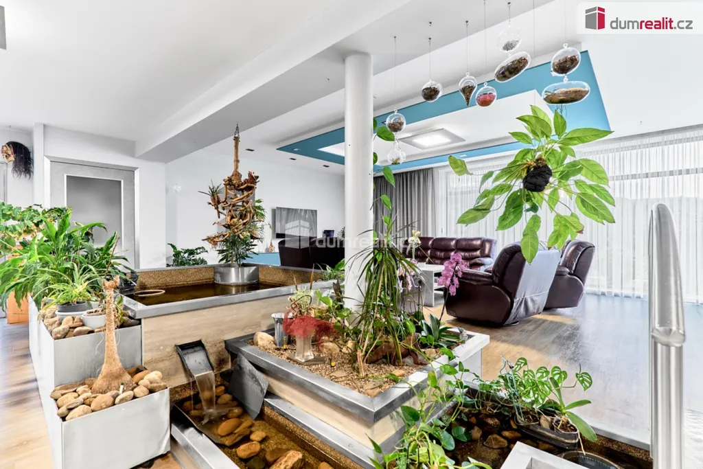 Dominantou vily je velkorysý obytný prostor s kuchyní o rozloze cca 142 m², jehož srdcem jsou dvě jezírka propojená tekoucím potůčkem. Tento živý přírodní prvek se nachází přímo uvnitř domu a tvoří jedinečné centrum celého prostoru – místo klidu, světla a výjimečné atmosféry.