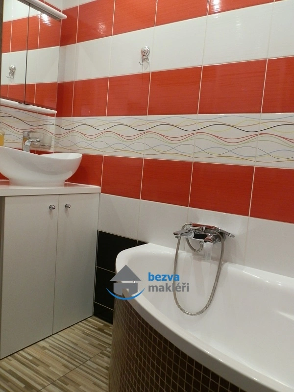 Koupelna je zařízena rohovou vanou, umyvadlem se skříňkou a je zde i prostor pro pračku. WC je oddělené. Ohřev teplé vody zajišťuje bojler.