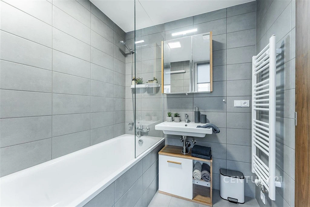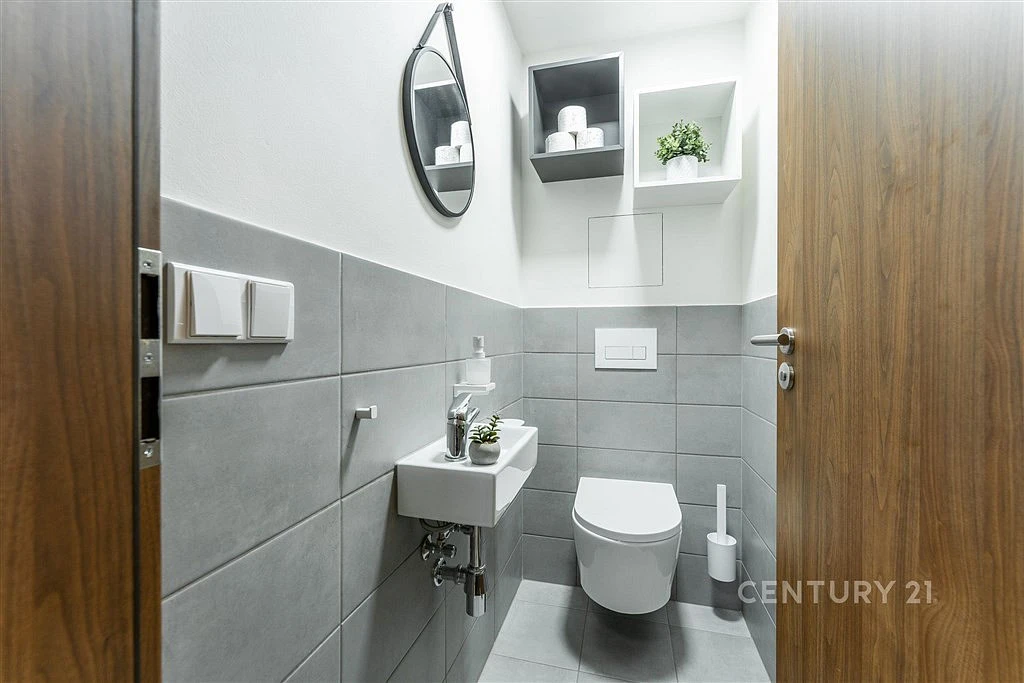 Místnosti jsou neprůchozí, velkoformátové okno v koupelně zajišťuje denní světlo. WC je samostatné, s vlastním umyvadlem.