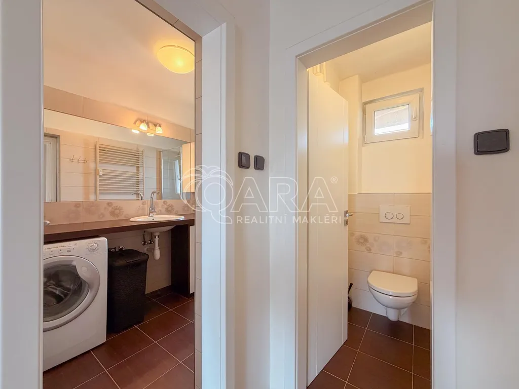 Koupelna disponuje sprchovým koutem, umyvadlem a pračkou, toaleta je samostatná. Velkou výhodou je také šatna, která nabízí dostatek úložného prostoru. Příjemným benefitem jsou dva balkony jeden přístupný z kuchyně a druhý z pokoje, což výrazně zvyšuje komfort bydlení. K bytu náleží také velká zděná sklepní kóje (6,6 m2).
