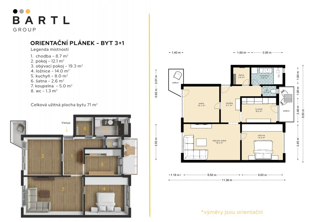 Byt prošel rekonstrukcí a dnes nabízí moderní a vkusně řešené bydlení. Ze vstupní chodby je přístup do jednotlivých místností - samostatného pokoje, kuchyně, koupelny, samostatného WC, šatny a prostorného obývacího pokoje s ložnicí.