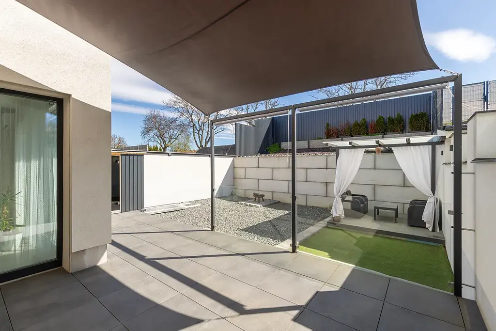 Dominantou domu je světlý obývací prostor s francouzskými okny se vstupem na venkovní terasu a do uzavřeného dvorku, který poskytuje dostatek soukromí pro odpočinek i rodinné aktivity.