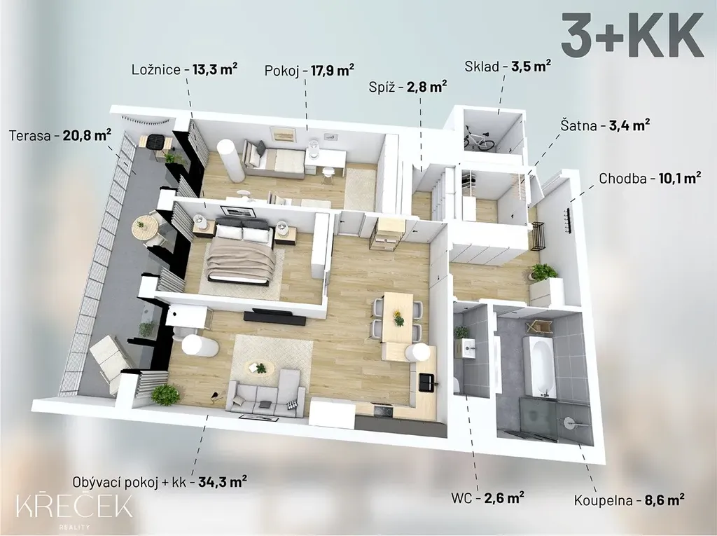 Byt 3+kk o celkové ploše 97 m² ve 4. nadzemním podlaží nabízí komfortní prostor s terasou 21 m² a praktickým sklepem (3 m²) na patře. Standardem jsou teplovodní podlahové vytápění, velkoformátová okna a vysoké stropy.
