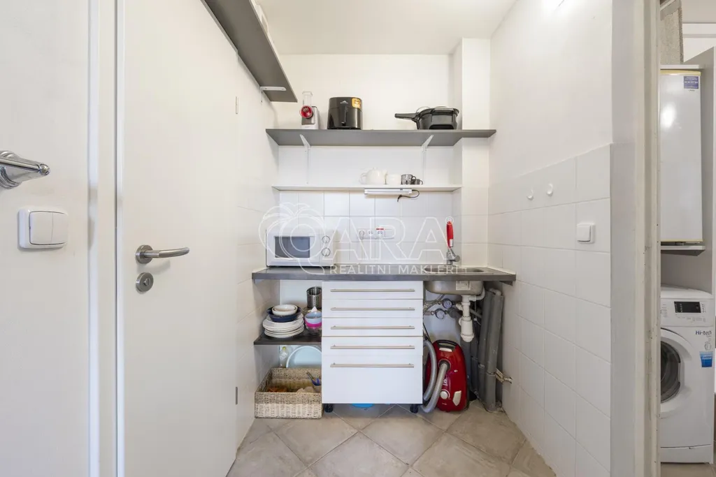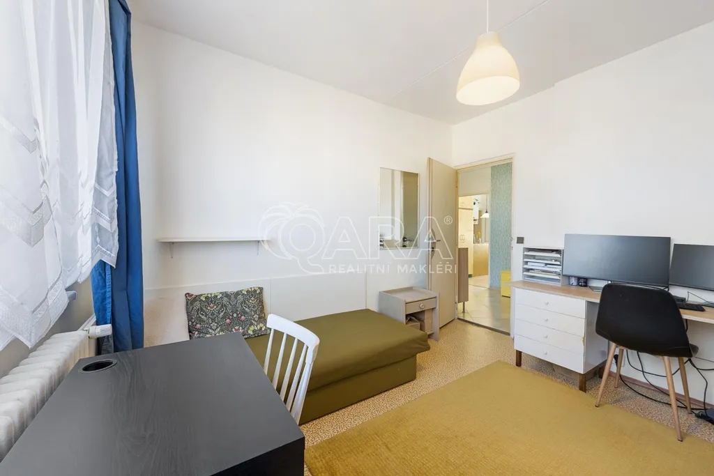 Původní dispozice 5+1 byla chytře upravena. Aktuálně je prostor rozdělen na velkorysý byt 5+kk a přiléhající garsonku.