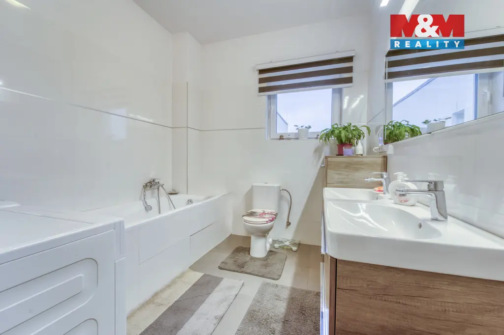 V přízemí na vás čeká prostorný obývací pokoj s krbovými kamny a moderní kuchyňským koutem s vestavnými spotřebiči, dále také toaleta a šatna. V patře máme tři neprůchozí pokoje a koupelnu s vanou a dvojitým umyvadlem.