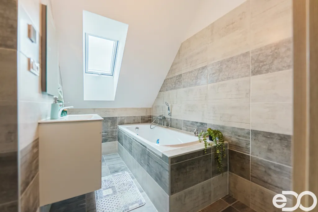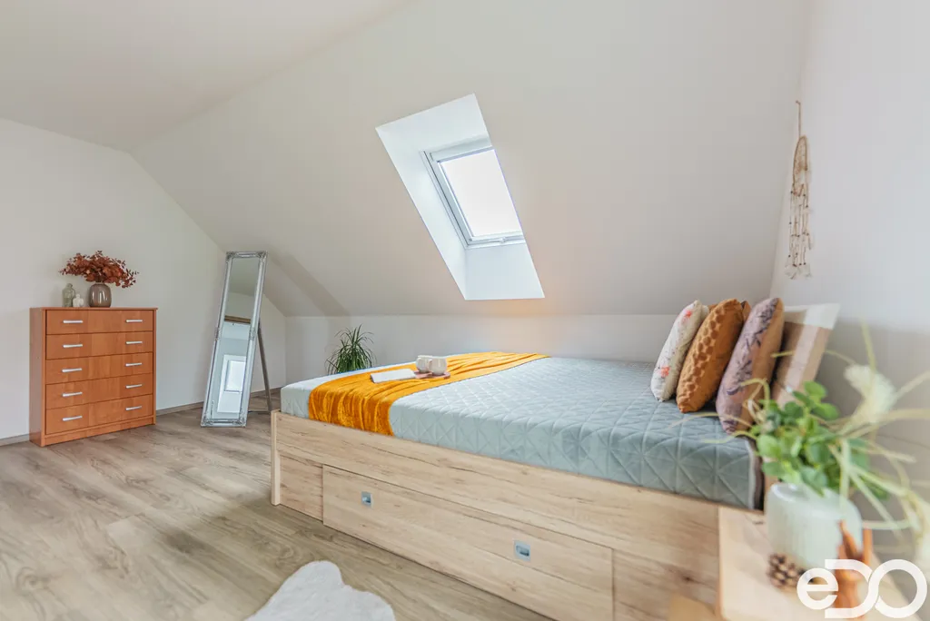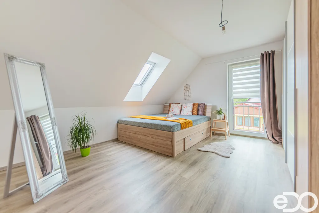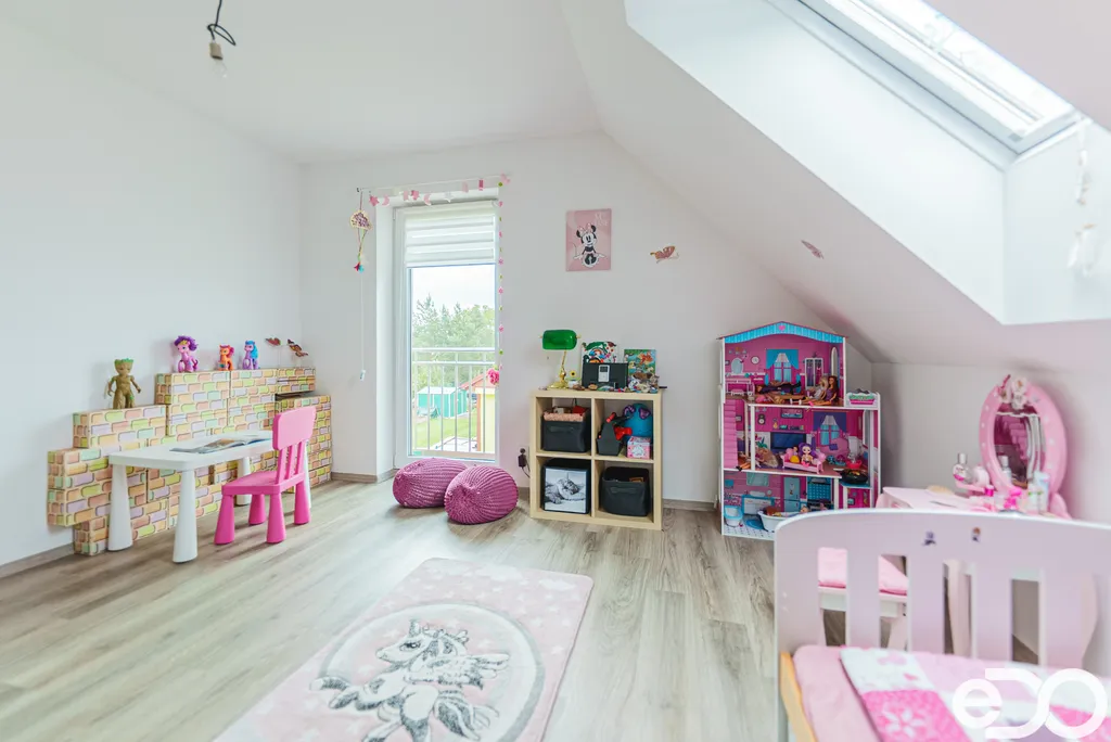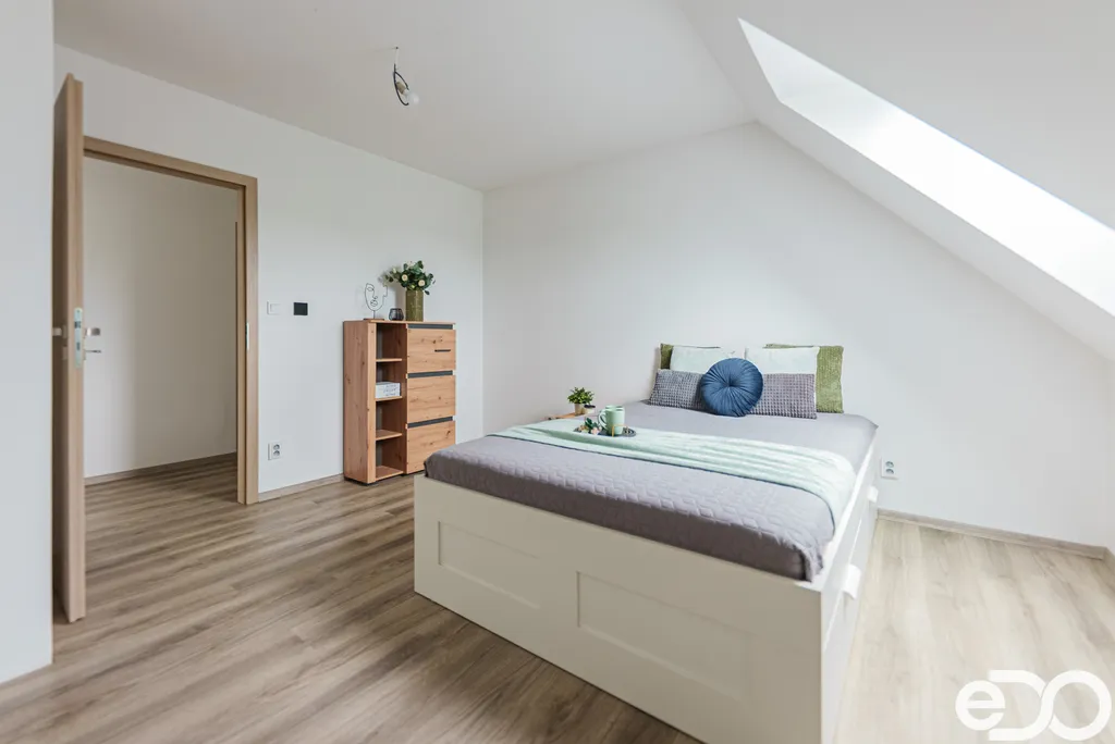 V patře jsou k dispozici tři pokoje, koupelna s vanou a WC. Součástí domu je také půdní prostor o velikosti cca 23 m², který nabízí možnost dalšího využití, například jako pracovna, herna nebo další ložnice.