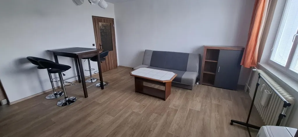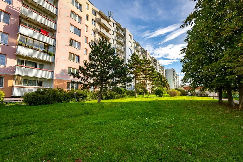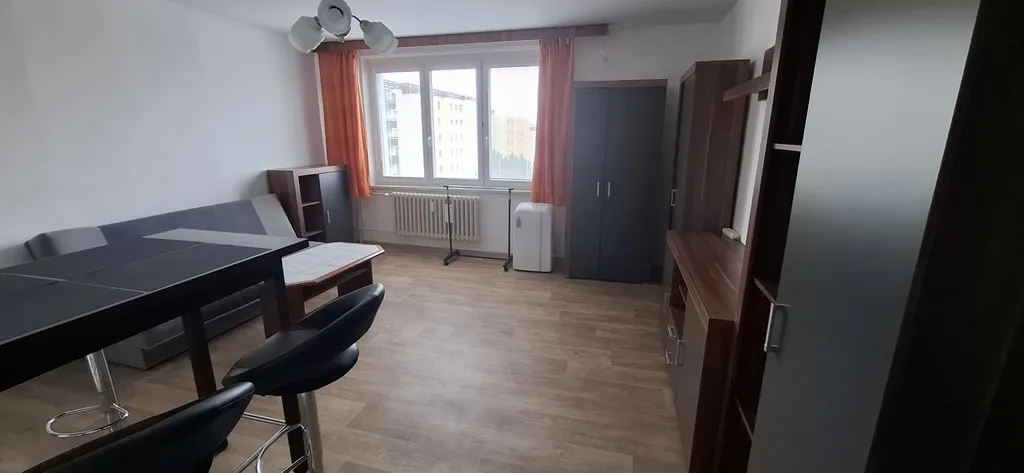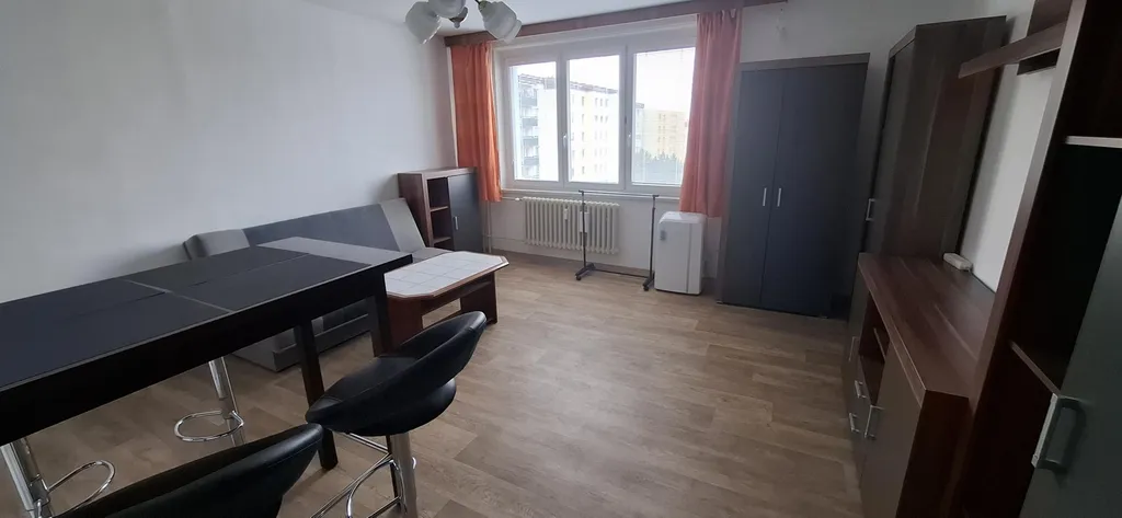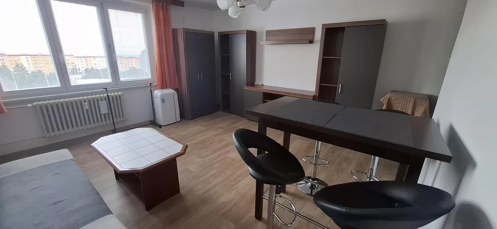 Dispozice: vstupní halová předsíň, samostatné vstupy do všech místností, nová koupelna se sprchovým koutem, nové WC, ložnice, obývací pokoj s novou kuchyňskou linkou do L ( elektrický sporák s elektrickou varnou deskou, digestoř, myčka) lednice s mrazícím boxem a nová pračka v předsíni. Byt je zařízen, včetně nábytku v obývacím pokoji, v předsíni šatní skříň, v ložnici skříň, pouze chybí spací lůžko. Podlahy lino, koberec a dlažba. nové interiérové žaluzie, mobilní klimatizace, nově vymalováno. Dům je po revitalizaci (plastová okna, zateplení vč. fasády, výtah, vstupní dveře).