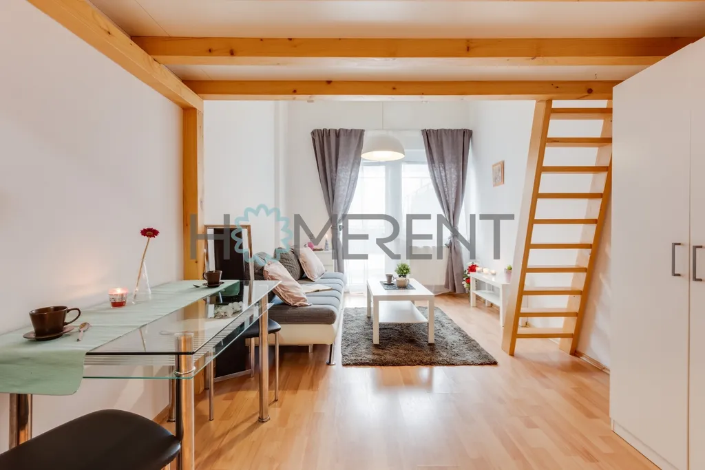 Interiér bytu je řešen prakticky a zároveň útulně. Dominantním prvkem je patrová postel s novou matrací, která chytře šetří prostor a vytváří místo pro obývací část s gaučem. Kuchyň je plně vybavena všemi spotřebiči a doplněna o jídelní stůl. Koupelna nabízí sprchový kout, toaletu a pračku.