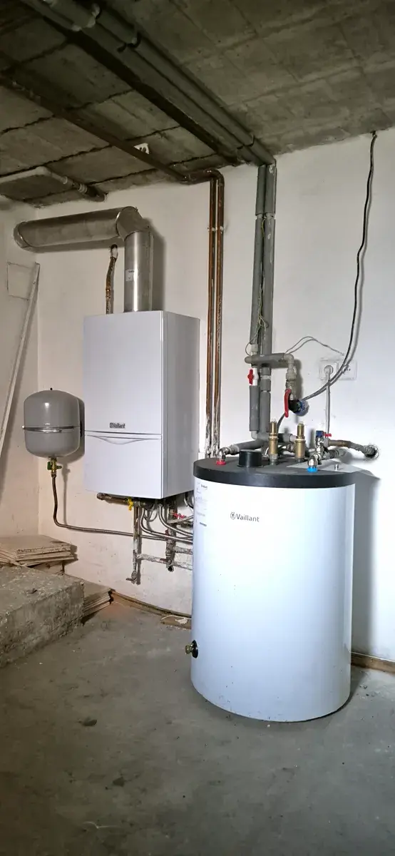 V suterénu se nachází technická místnost (sklep), kde je umístěn plynový kotel zn. Vaillant se 120L zásobníkem na teplou vodu a el. přípojka na 380V.