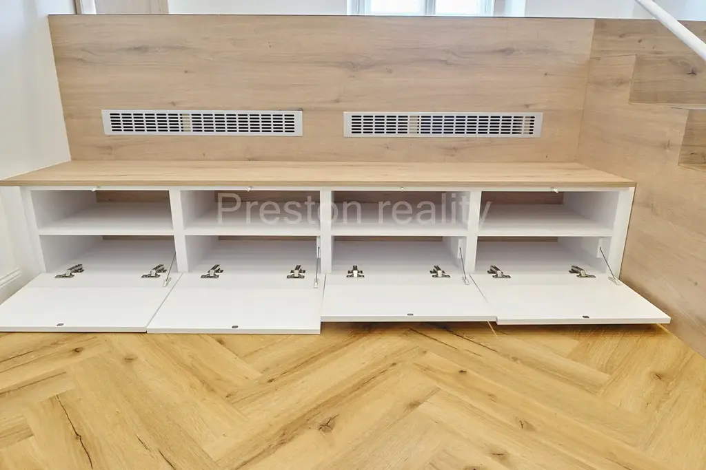 Prostory se skládají ze třech hlavních místností, z nichž 2 jsou neprůchozí: průchozí vstupní místnost (17 m2) je vybavena věšáky a botníky integrovanými do lavice. Další místnost se stejnou orientací do ulice (23 m2) je nevybavena, obě tyto místnosti mají na podlahách položeny nové parkety. Třetí nevybavená místnost s orientací do dvora (17 m2) má na podlaze zátěžovou umělohmotnou pokládku. První dvě místnosti a kuchyň mají podlahové vytápění.