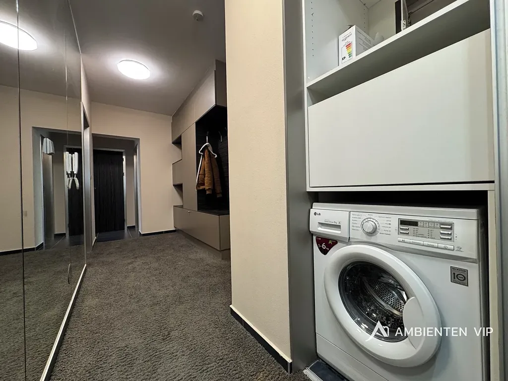 Vybavení bytu: moderní kuchyňská linka s veškerými spotřebiči (varná deska, trouba, digestoř, mikrovlnná trouba, chladnička, myčka nádobí), pračka, vestavěné skříně, postele, sedací souprava, konferenční stolek, venkovní žaluzie.