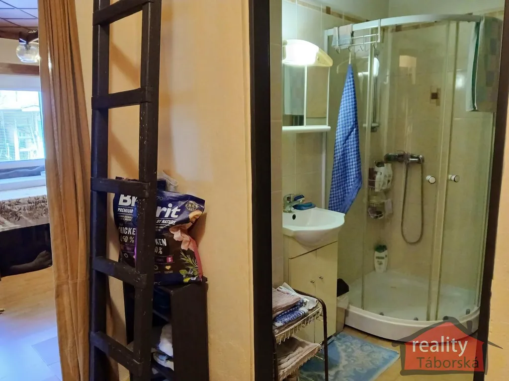 V koupelně se nachází sprchový kout, umyvadlo, toaleta a příparava na pračku.