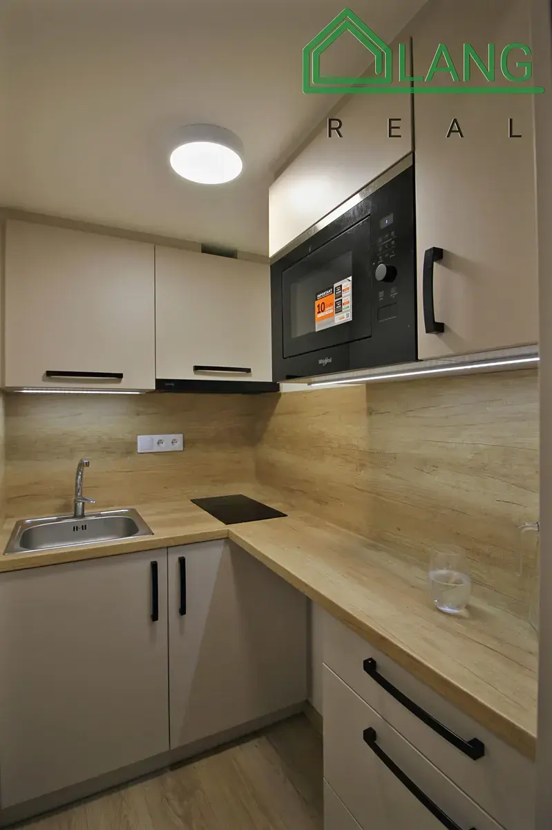 V kuchyni je na míru vyrobená kuchyňská linka vybavena mikrovlnnou kombinovanou troubou troubou, sklokeramickou varnou deskou a lednicí.