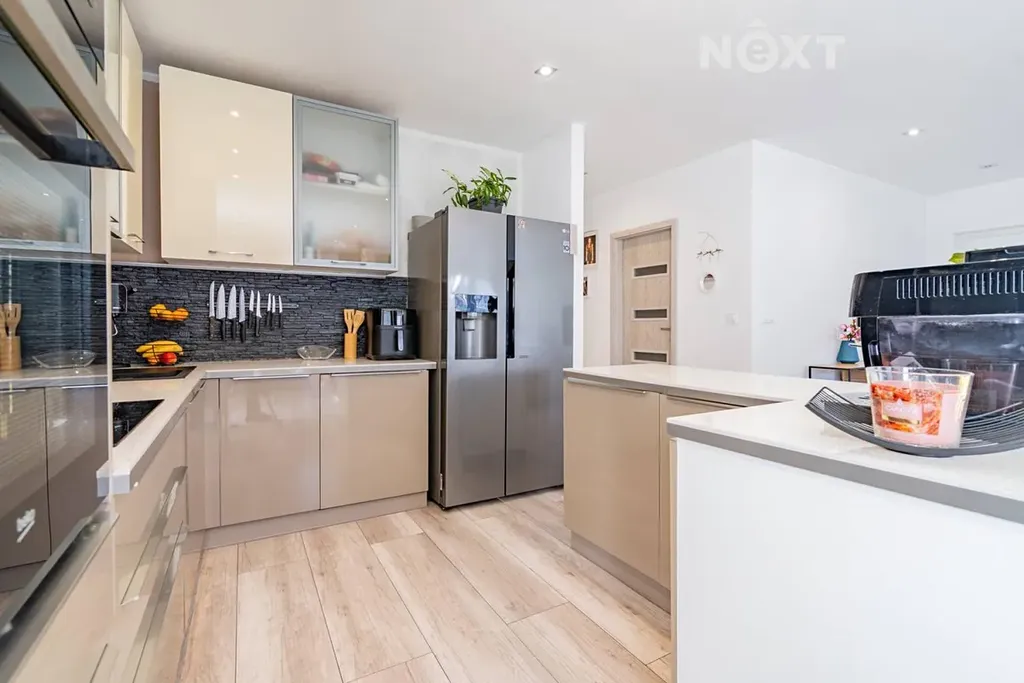 Dům má zastavěnou plochu 216 m². Po vstupu se nachází zádveří se samostatnou šatnou, odkud vede vstup do velmi prostorného obývacího pokoje s velkými francouzskými okny orientovanými do zahrady. Obývací pokoj je propojen s kuchyní, která nabízí dostatek úložného prostoru, vestavnou myčku, elektrickou troubu, mikrovlnnou troubu, indukční varnou desku i lednici. Celý interiér působí vzdušně, je plný přirozeného světla a nabízí příjemnou domácí atmosféru. Z obývacího pokoje lze vstoupit do dětského pokoje.