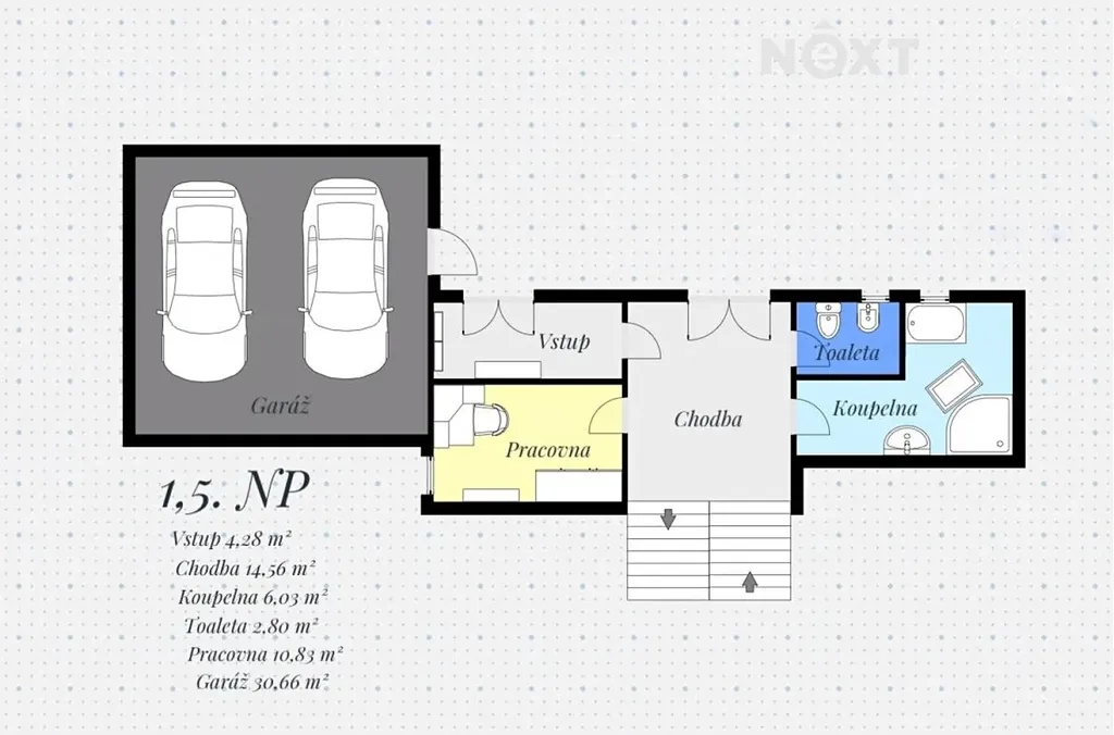 Součástí nemovitosti je dvojgaráž o velikosti 30,66 m², která poskytuje komfortní parkování pro dvě vozidla i prostor pro uskladnění věcí. K dispozici je také zastřešená terasa, která nabízí možnost příjemného venkovního posezení.