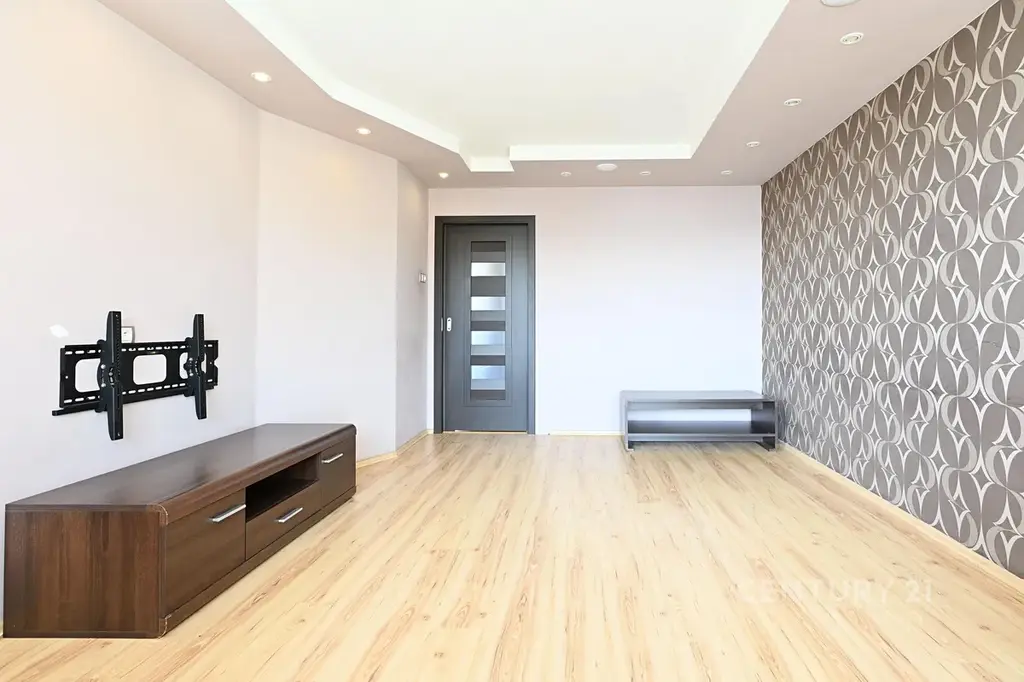 Obývací pokoj: Místnost s dekorativní tapetou, sádrokartonovými podhledy s bodovým osvětlením a plovoucí podlahou. Součástí prezentace jsou i vizualizace pro lepší představu o budoucím uspořádání.