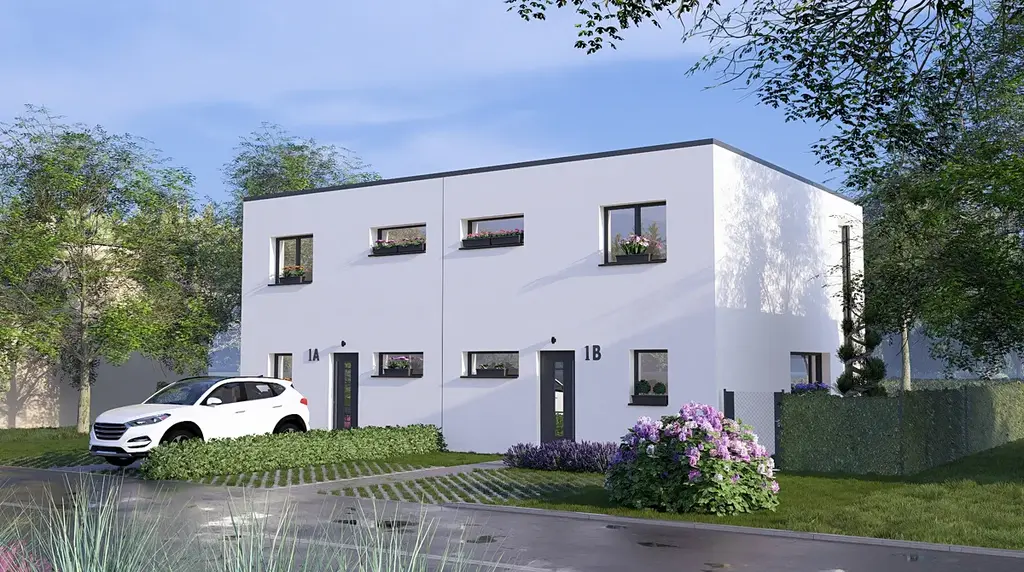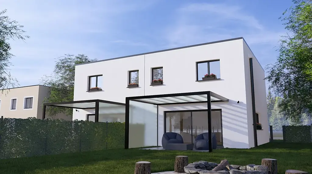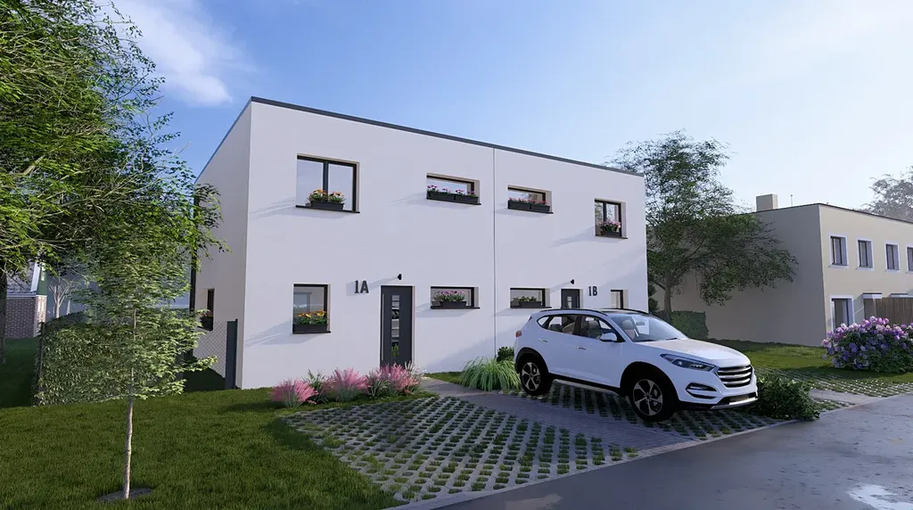 Dům je navržen v moderním, čistém stylu s důrazem na funkčnost a dostatek přirozeného světla. Každá polovina domu má vlastní vstup i zahradu, což zajišťuje maximální soukromí.