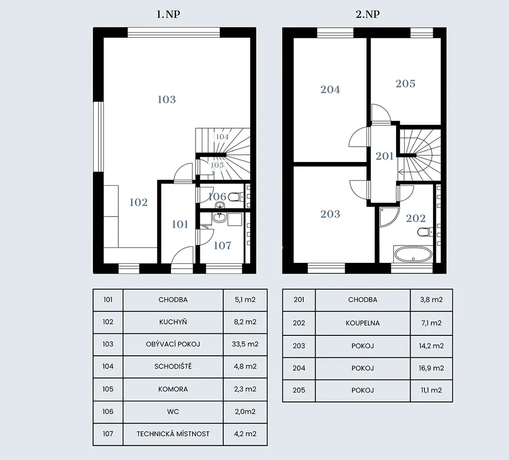V patře jsou situovány tři samostatné pokoje, ideální jako ložnice, dětské pokoje nebo pracovna, dále prostorná koupelna a chodba. Dispozice domu nabízí dostatek soukromí pro všechny členy rodiny.