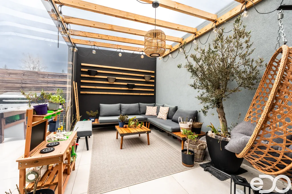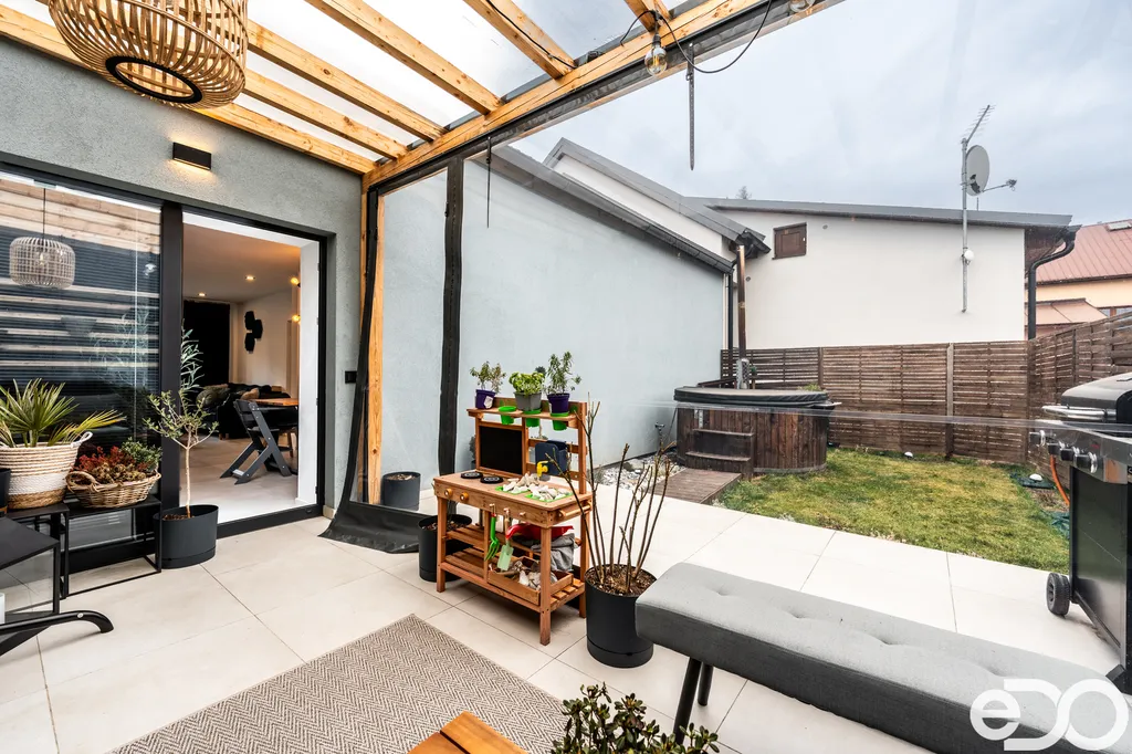 Srdcem domova o velkorysé dispozici 4+1 je prosvětlený otevřený prostor propojující kuchyni s jídelnou a obývacím pokojem. Celý interiér je navržen tak, aby působil vzdušně a zároveň poskytoval maximální komfort pro každodenní rodinné setkávání. Na obytnou část plynule navazuje prosklená zimní zahrada, která tvoří přirozený most mezi interiérem a soukromou venkovní oázou. Právě zde najdete naprostý klid v podobě menší udržované zahrádky s vířivkou a prostorem pro grilování.