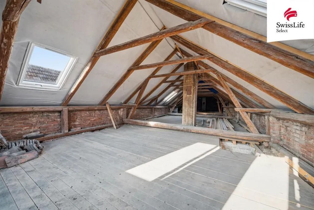 Podkroví: Velkorysý prostor s novým krovem a střešními okny (možnost 23 pokojů). Stylové cihelné štíty jako designový prvek.