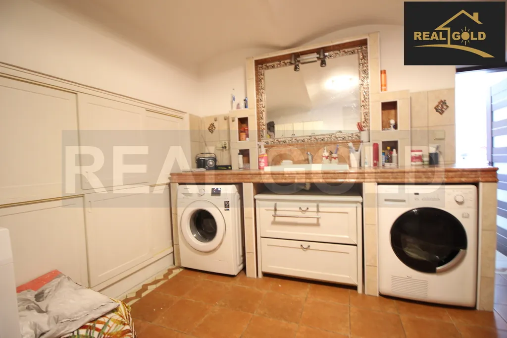 1) přízemí: vstupní chodba/zádveří, schodiště do 1.patra, šatna a 2 koupelny -jedna s masážním sprchovým koutem, WC a technickým zázemím (kotel) a druhá s vanou, 2 umyvadly, pračkou, sušičkou.