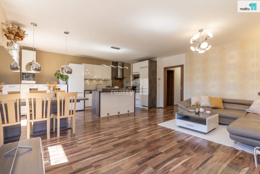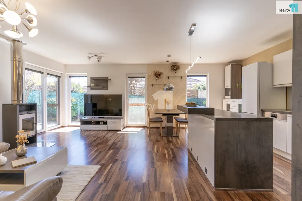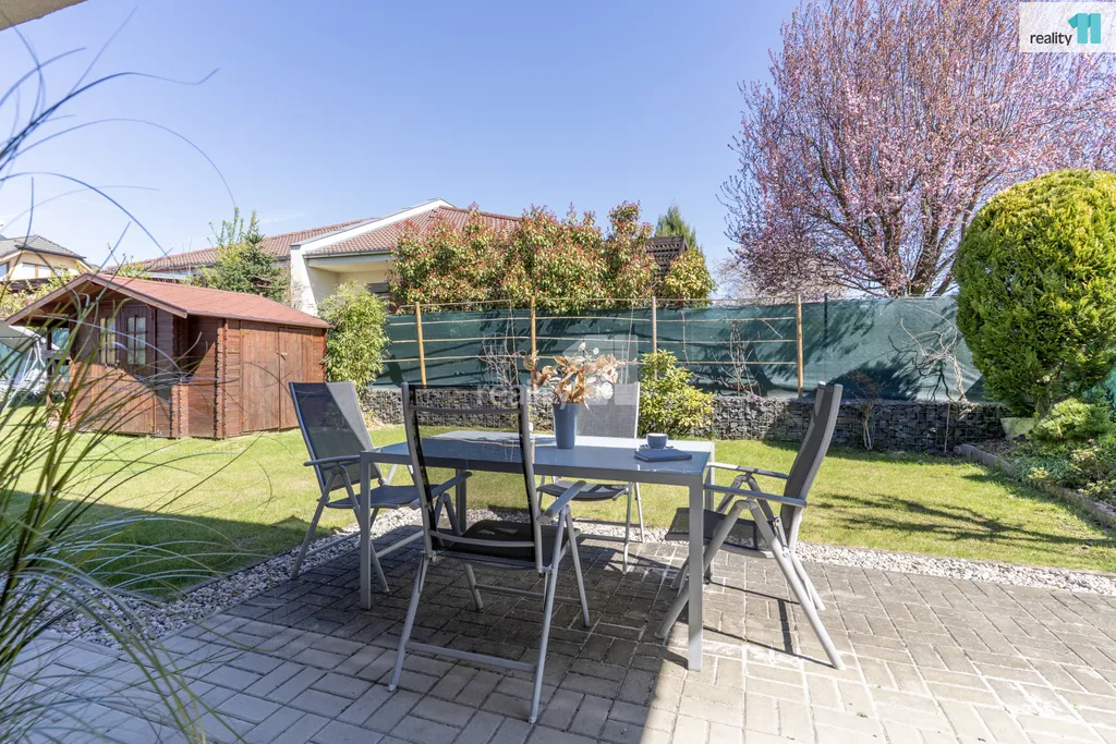 Užitná plocha domu činí přibližně 101 m² a je situován na pozemku o výměře 453 m². Dominantou interiéru je obývací pokoj s kuchyňským koutem a jídelní částí, odkud je zajištěn přímý vstup na terasu a do udržované zahrady. Ta poskytuje dostatek soukromí pro relaxaci, rodinné posezení i volnočasové aktivity. Součástí zahrady je také praktický zahradní domek pro uskladnění nářadí a sezónního vybavení.