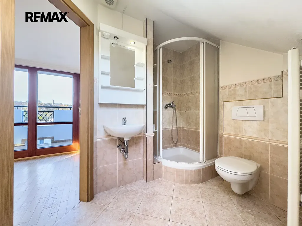 Hlavním lákadlem bytu je však prostorná střešní terasa o velikosti 18m2, která je umístěna do vnitrobloku a nabízí výjimečný a nerušený výhled na celou Prahu. Výhledově bude společenství vlastníků jednat o instalaci výtahu.