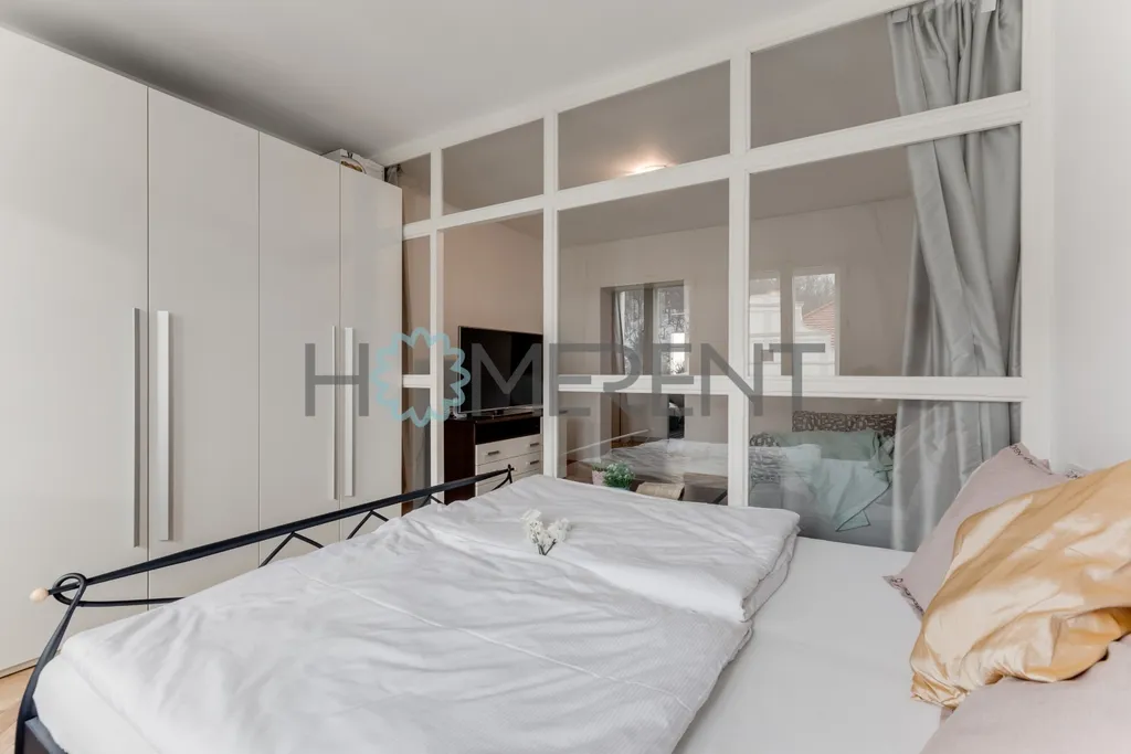Hlavní obytná místnost je chytře rozdělena na dvě části, díky čemuž byt působí jako menší 2+1. V přední části se nachází obývací prostor s gaučem a televizí. Díky prosklené stěně směrem do ložnice sem proudí příjemné denní světlo, které celý prostor krásně prosvětluje. Ložnici je zároveň možné vizuálně oddělit pomocí závěsů, takže si zachovává dostatek soukromí. V ložnici najdete manželskou postel a velkou šatní skříň, která poskytuje dostatek úložného prostoru.