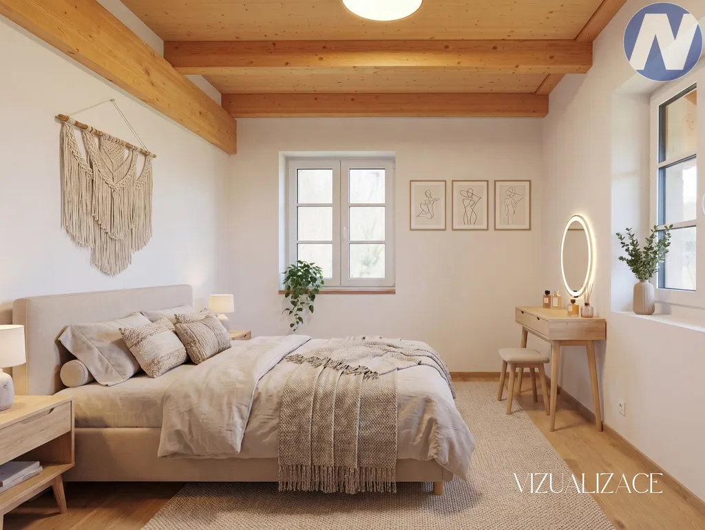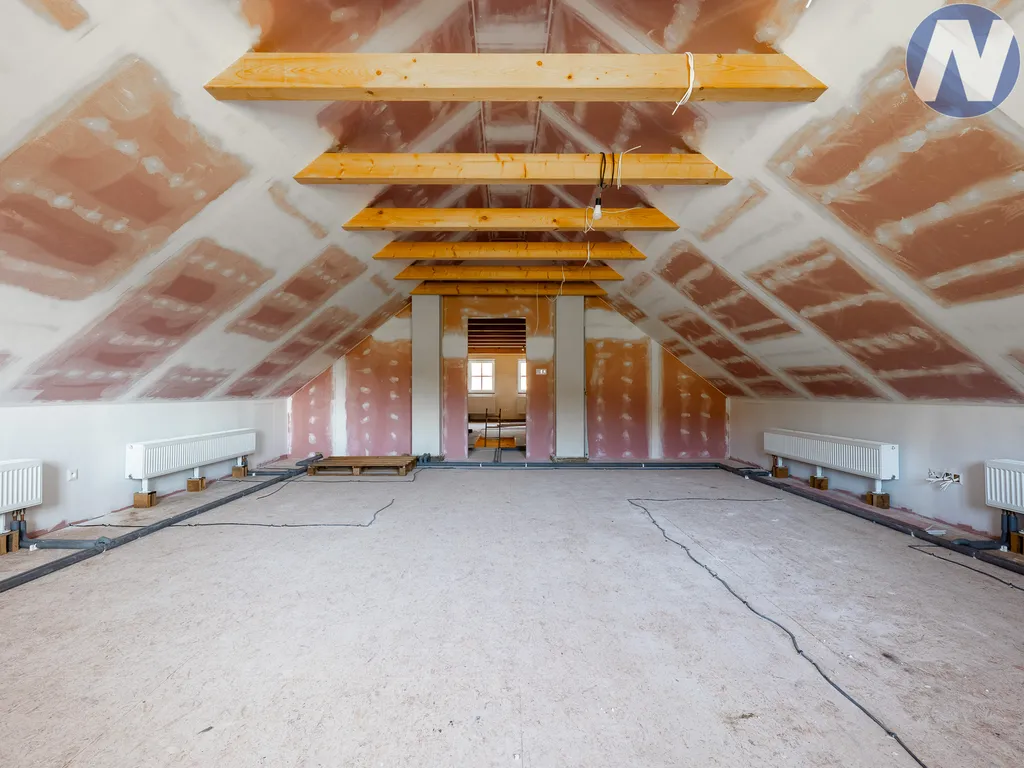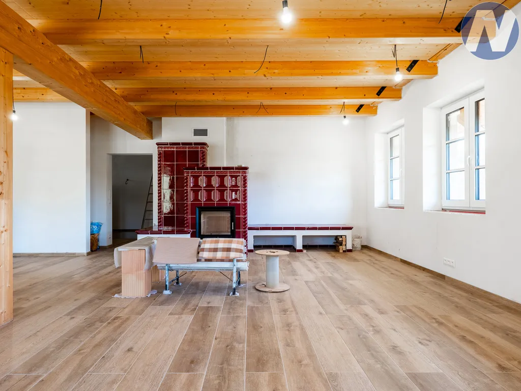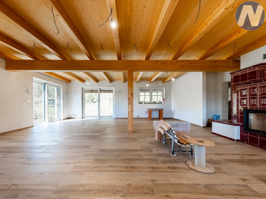 Srdcem domu je velkorysá hlavní obytná zóna s kuchyní, jídelnou a obývacím prostorem. Celý prostor působí vzdušně, světlě a reprezentativně. Dominantním prvkem jsou masivní dřevěné stropy a velká kachlová kamna, která dotvářejí jedinečnou atmosféru společenské místnosti. Dům nabízí dvě koupelny, velké množství úložných prostor a promyšlené dispoziční řešení. Podkroví bylo původně navrženo jako herna s prostorem pro kulečník, nicméně celý tento prostor lze využít i pro vytvoření dalších samostatných ložnic či soukromé obytné části.