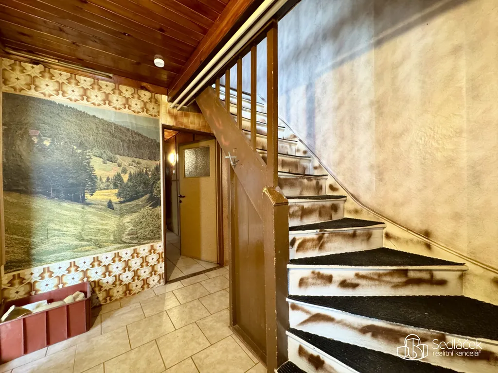 Interiér odpovídá stáří nemovitosti – původní omítky, podlahy i rozvody (elektro, voda, plyn). Vytápění je řešeno plynovými kamny a kamny na tuhá paliva. Revize komína i plynového zařízení byla provedena.