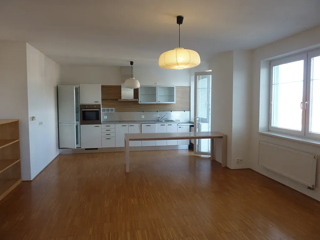 Z obdélníkové chodby vejdete do velkého pokoje s kuchyňskou zónou vybavenou novou kuchyňskou linkou se všemi spotřebiči. Odsud je vstup na malý balkon, na kterém si v létě po návratu z práce rádi dáte skleničku vína nebo ráno šálek čaje.