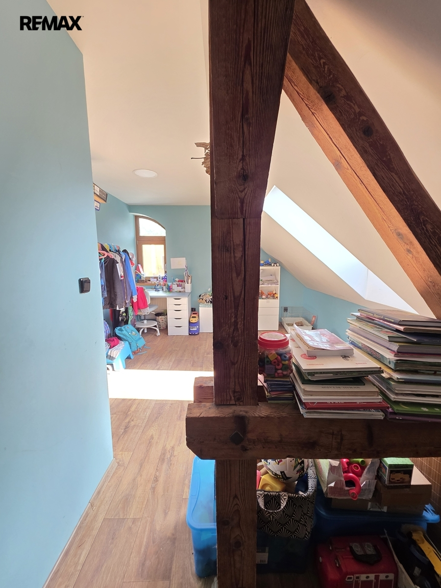V podkroví se nacházejí dva obytné pokoje a místnost připravená na dokončení koupelny s toaletou. Je nutná oprava střechy.