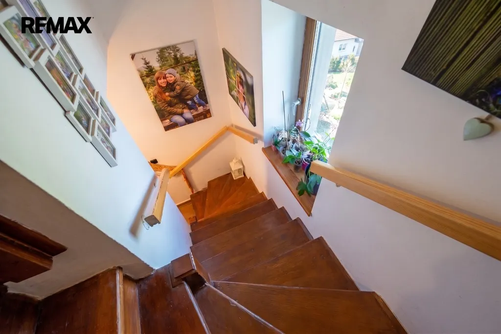 Interiérové dveře a schodiště do podkroví jsou z masivu. Jsou zde nová plastová okna s trojsklem.
