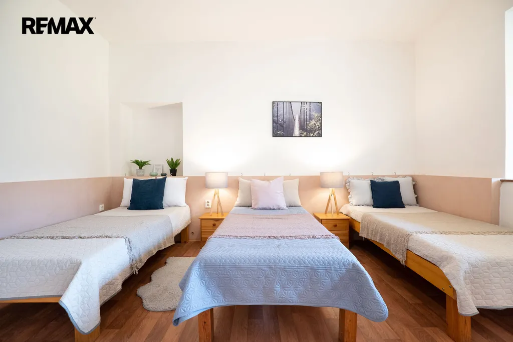 Dále je v 1. NP situován apartmán s 3x hostinským pokojem vždy po dvou lůžkách, se společnou koupelnou a kuchyňkou o celkové velikosti 68 m2.