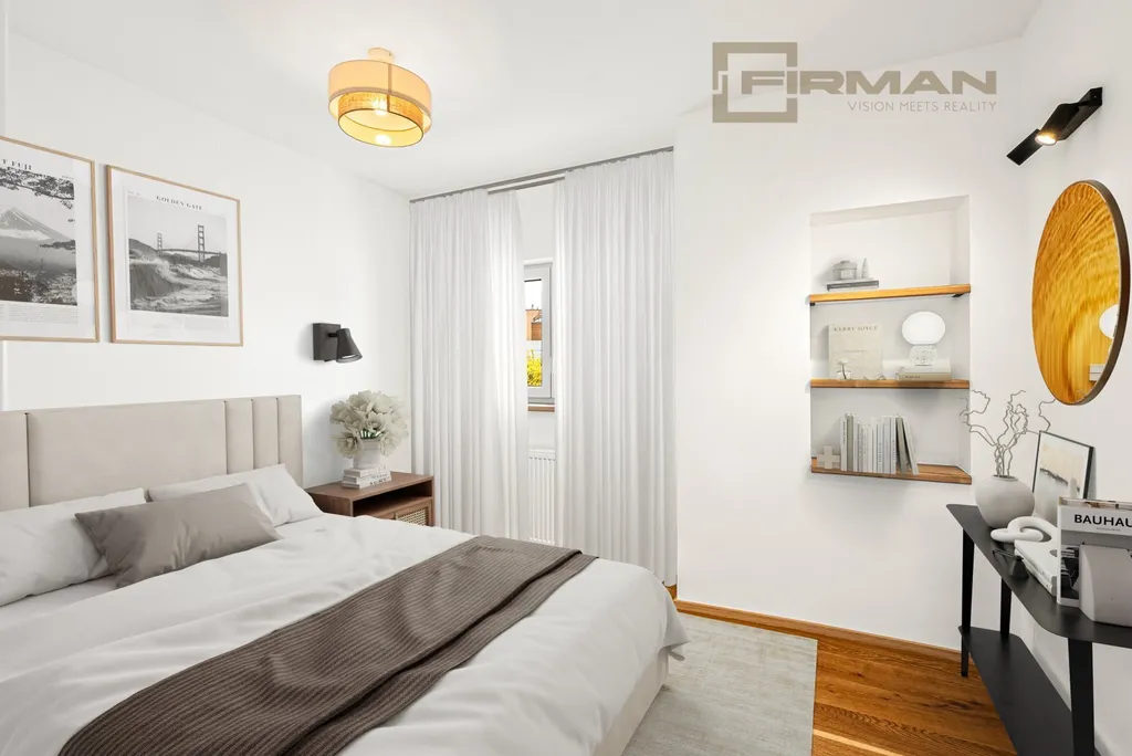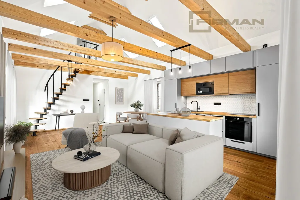 Horní byt zaujme otevřeným obývacím prostorem s novou kuchyní, vysokými stropy a přiznanými trámy. Samozřejmostí jsou moderní spotřebiče a dálkově ovládané střešní žaluzie. Součástí je také podkrovní místnost vhodná jako ložnice, pracovna nebo úložný prostor.