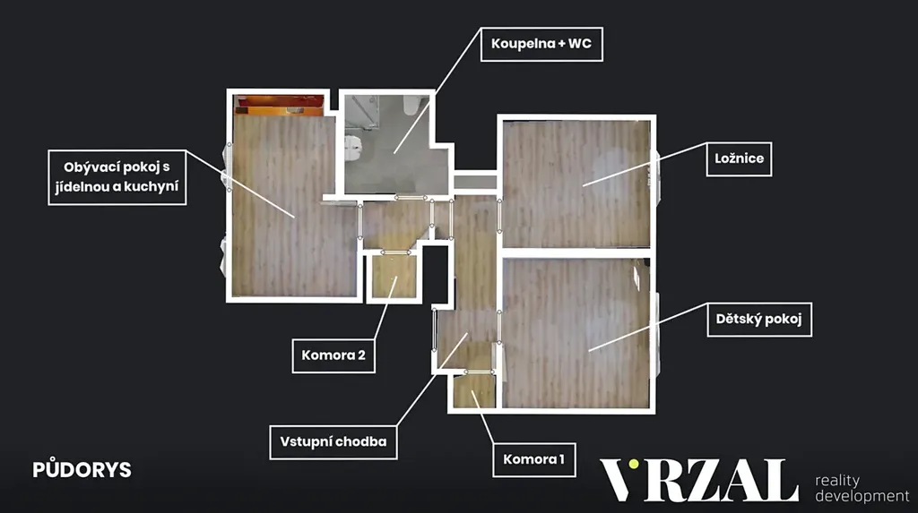 Byt se skládá z obývacího pokoje s kuchyní vybavené kuchyňskou linkou s elektrospotřebiči: el. trouba, varná deska, digestoř a myčka. Ze vstupní chodby je přístup do ložnice a dětského pokoje, dále také do koupelny se sprchovým koutem a toaletou. V neposlední řadě jsou v bytě k dispozici dvě komory, které lze využít třeba jako šatnu nebo úklidovou komoru.