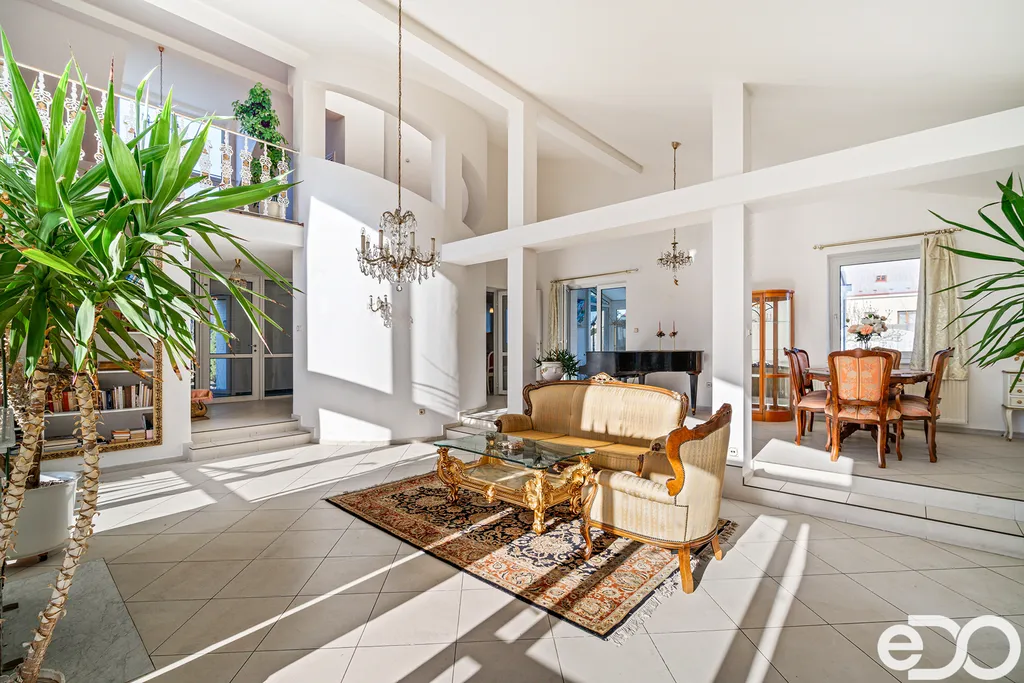 K dispozici je prostorná terasa s krbem, zimní zahrada a rozsáhlé technické zázemí v podzemním podlaží včetně dvojgaráže.