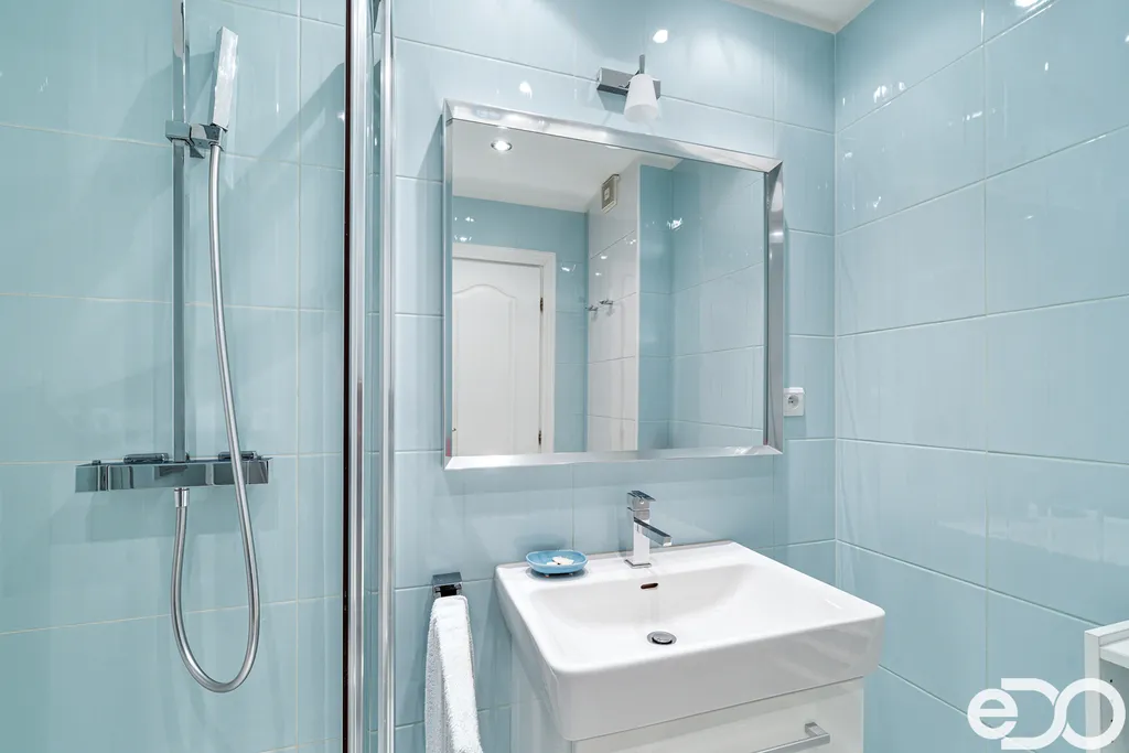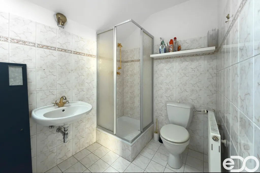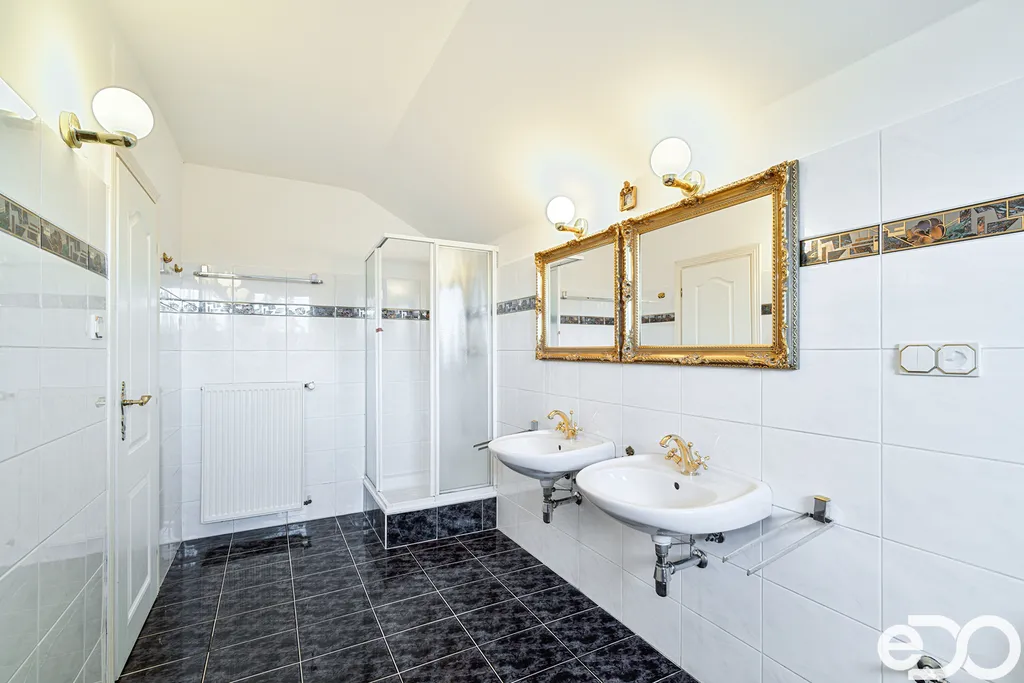 Koupelna z ložnice s vanou i sprchovým koutem, dvěma umývadly, WC. Koupelna z druhého pokoje, stejně jako v samostatné jednotce, se sprchovým koutem, umývadlem a WC.