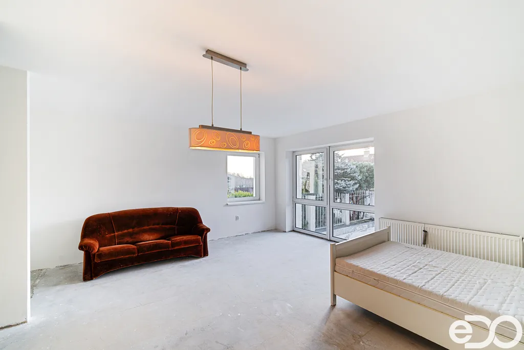 Samostatná garsonka má již odmontovánu kuchyňskou linku, vytápění a ohřev TUV zajišťuje centrální kotel.