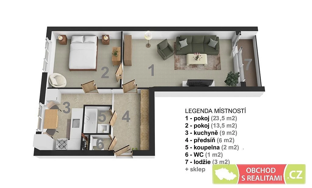 Byt nabízí dva pokoje (nemusí být průchozí), dva nezávislé vstupy! Z většího pokoje je přístupná lodžie, v prostorné předsíni se nachází vestavěné skříně, koupelna a WC jsou odděleně. Veškeré vybavení dle přiložené fotodokumentace (nyní ještě dojde k výměně vstupních dveří a instalaci osvětlovacích těles).