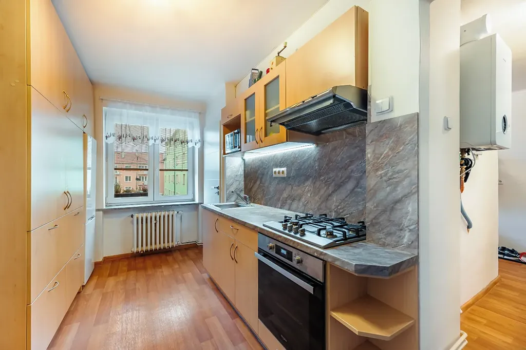 Na podlaze podlahové PVC (chodba, kuchyň), plovoucí podlaha (pokoje) a dlažba (koupelna a WC). Okna plastová, žaluzie, osvětlení ve všech pokojích. Vytápění a ohřev vody – samostatný plynový kotel, samostatné měřiče energií. K bytu patří společný balkon na chodbě a velký sklep 16 m2. Přípojka na internet, pevná linka. Ve vnitrobloku za domem k dispozici dvůr se zahradou. Byt se pronajímá se částečně zařízený. Parkování na ulici před domem, nebo na parkovišti vedle domu. Orientace pokojů na jih (do ulice Za Poštou), kuchyň na sever (do vnitro bloku).